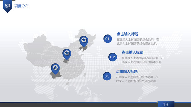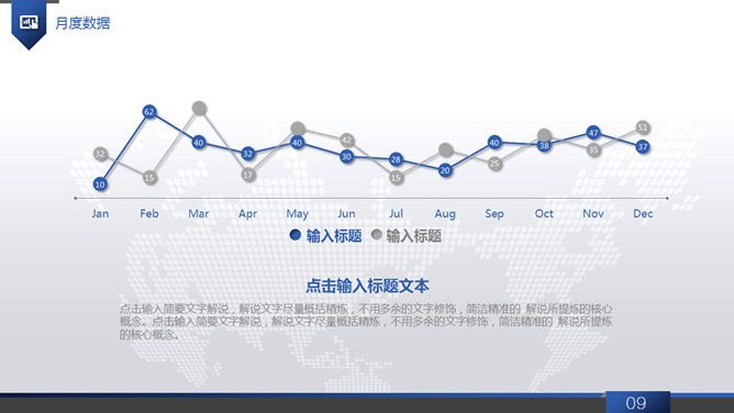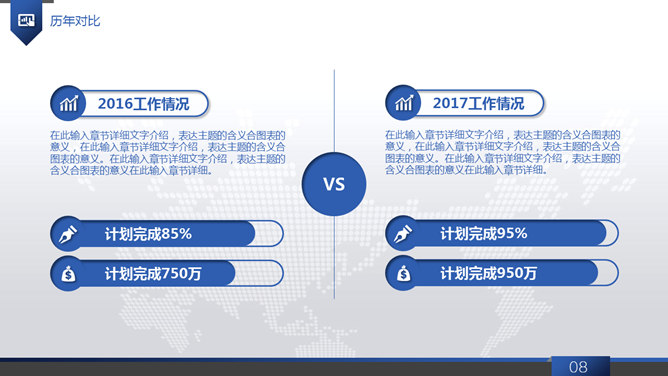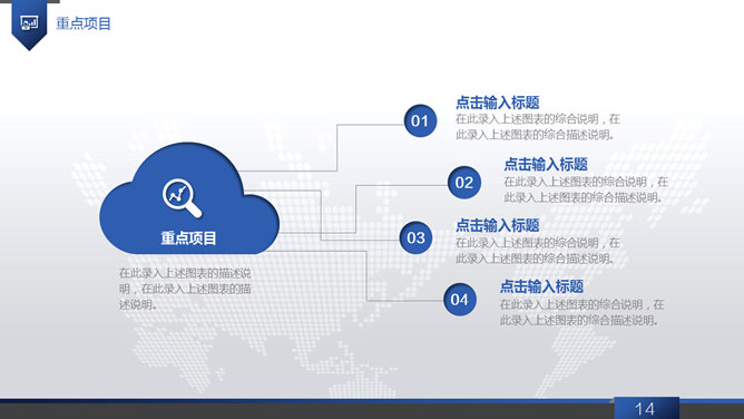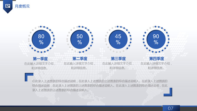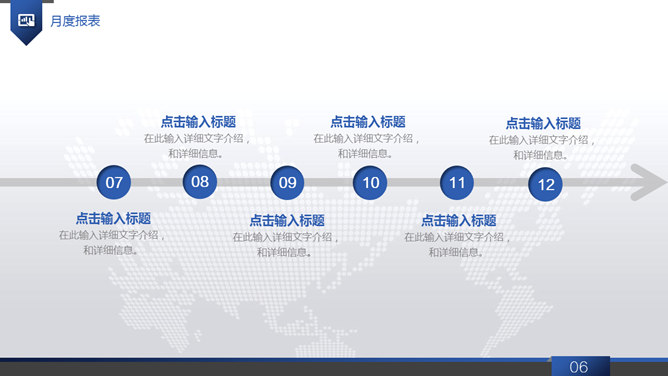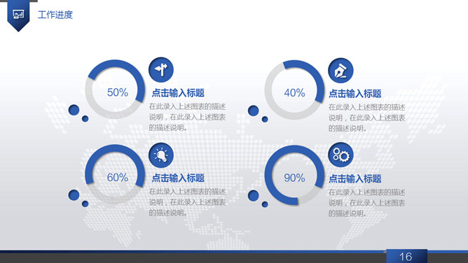 大气动态商务工作报告PPT模板。一套大气商务风工作总结报告幻灯片模板,浅灰世界地图背景,蓝色主色调,共40页,页面类型丰富实用,动态播放效果,稍作修改可用于公司介绍、产品宣扬等其他用途。