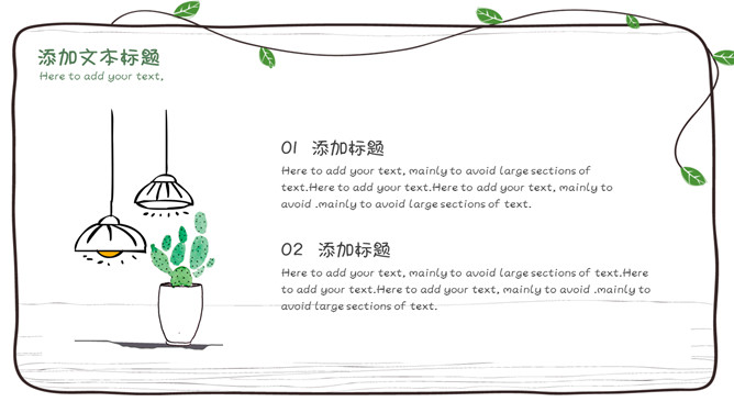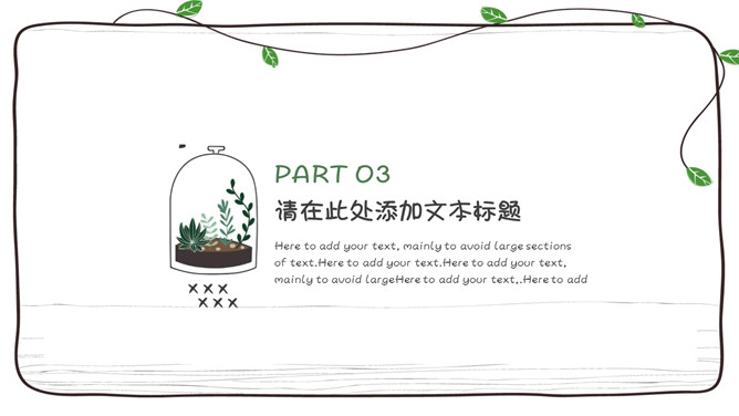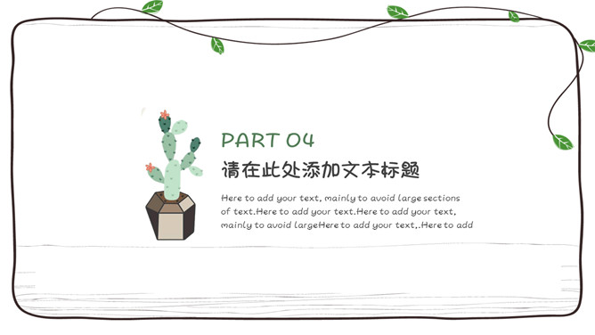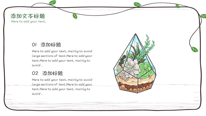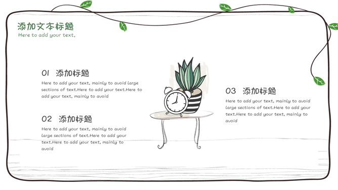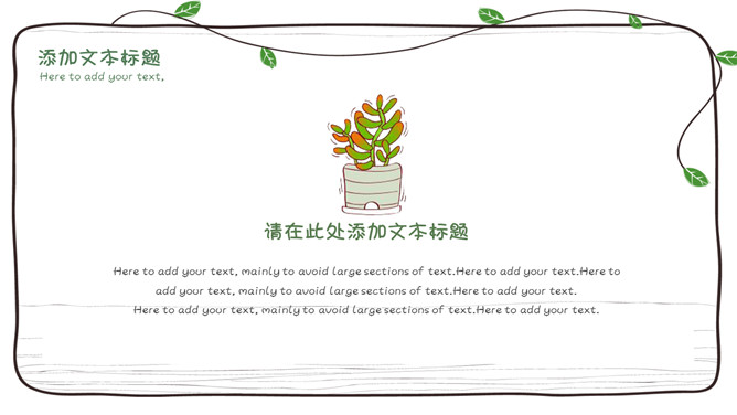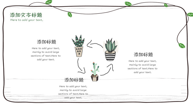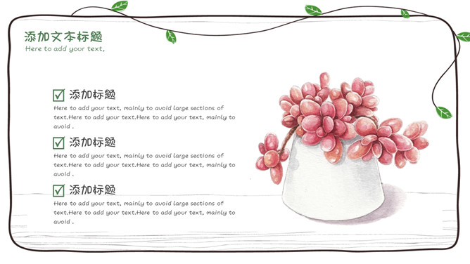 简约心爱藤蔓多肉植物PPT模板。一套简洁清新幻灯片模板,心爱藤蔓边框背景,卡通多肉植物素材装修。