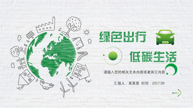 绿色出行低碳日子PPT模板。一套环保主题幻灯片模板,倡导绿色出行,低碳日子,构思精巧手绘设计风格。