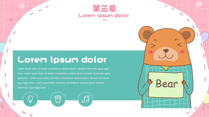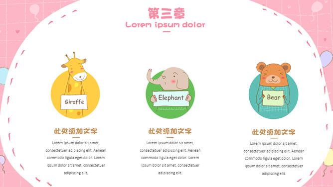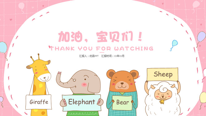卡通心爱动物童趣PPT模板。一套卡通风格幻灯片模板,心爱卡通动物背景。主张安装字体:华康海报体W12(P)。