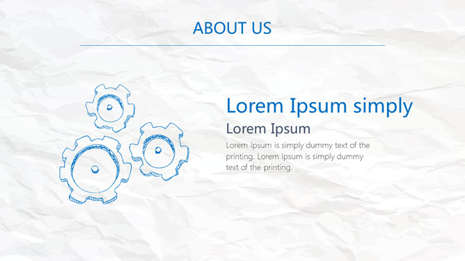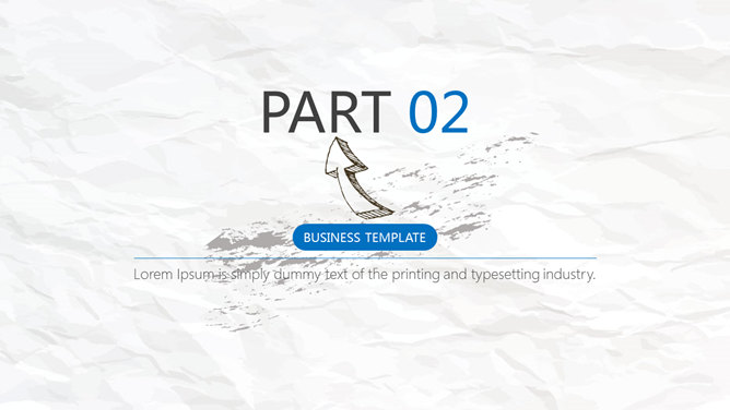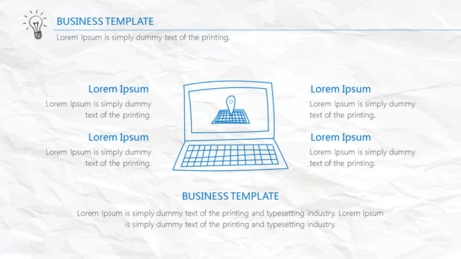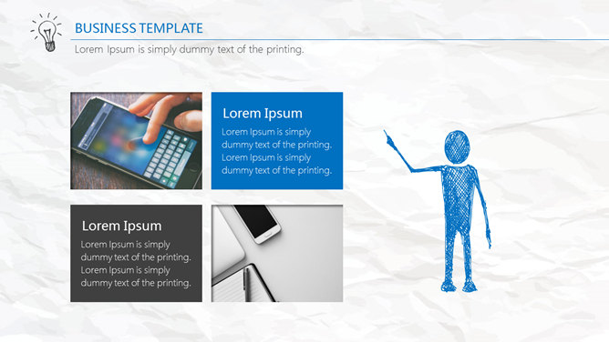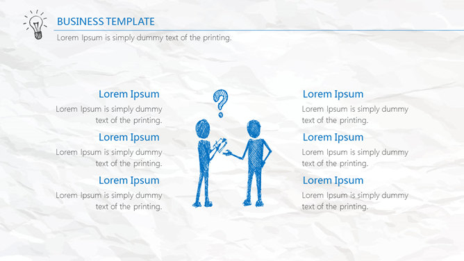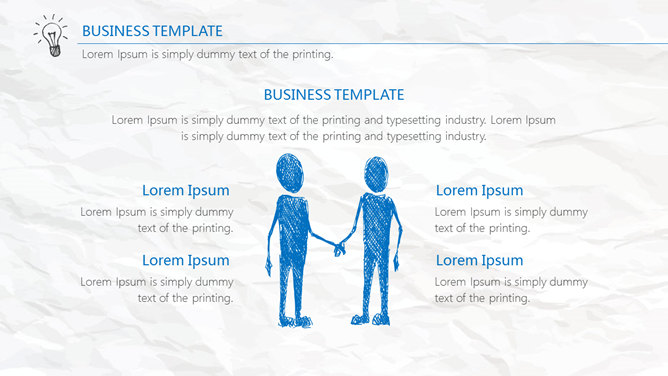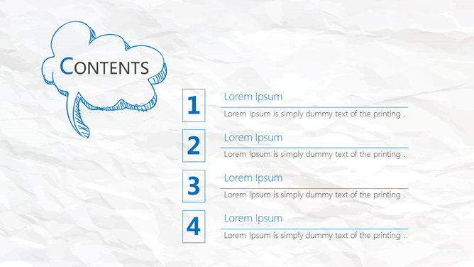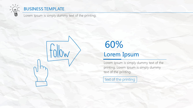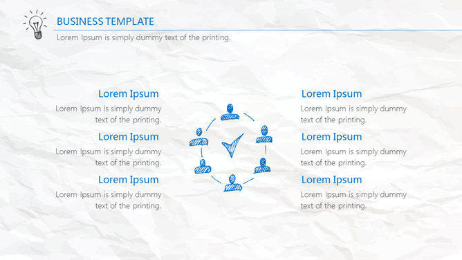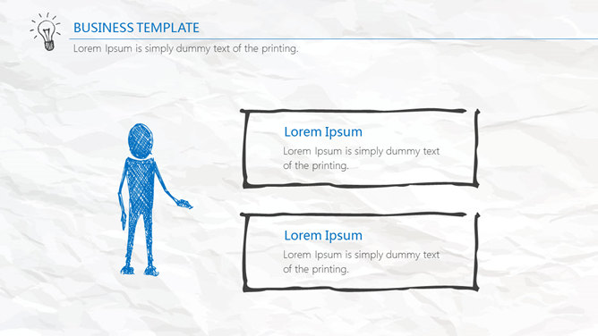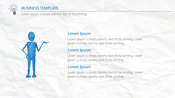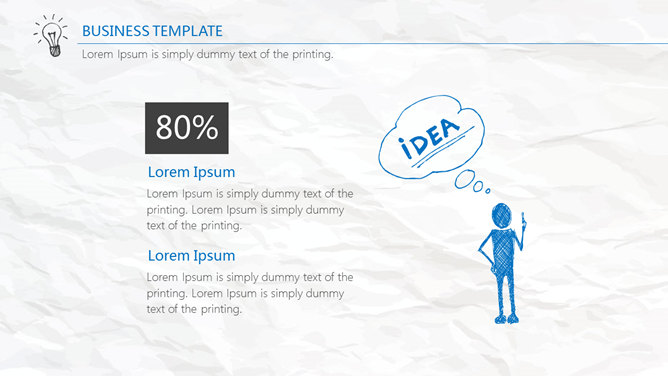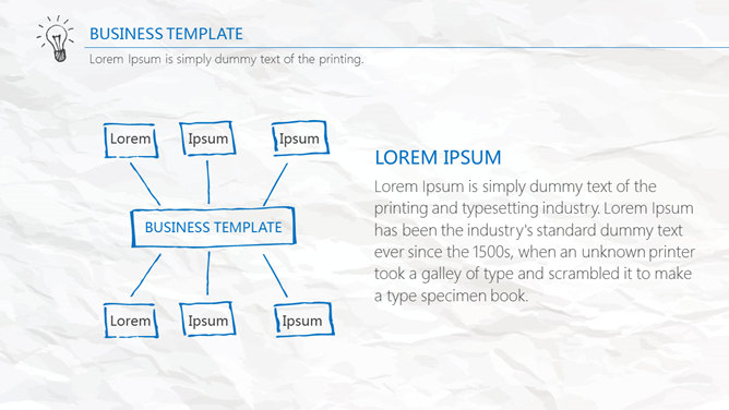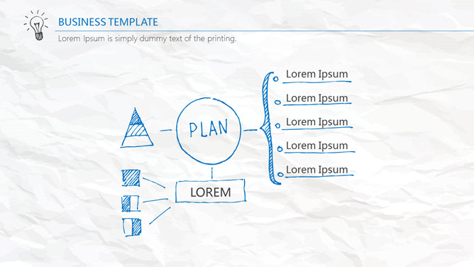 构思手绘卡通商务PPT模板。一套构思商务幻灯片模板,褶皱纸质布景,蓝色卡通手绘规划,页面类型丰富。