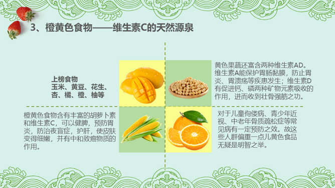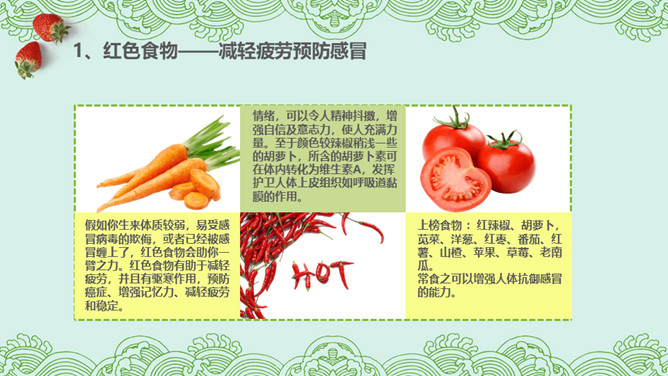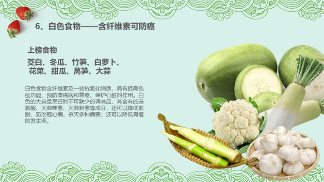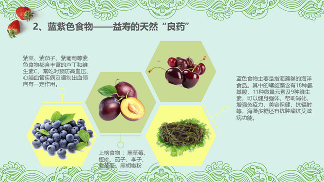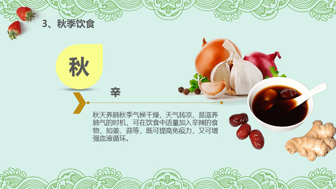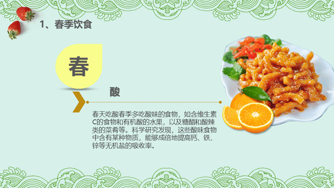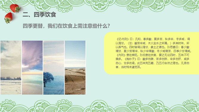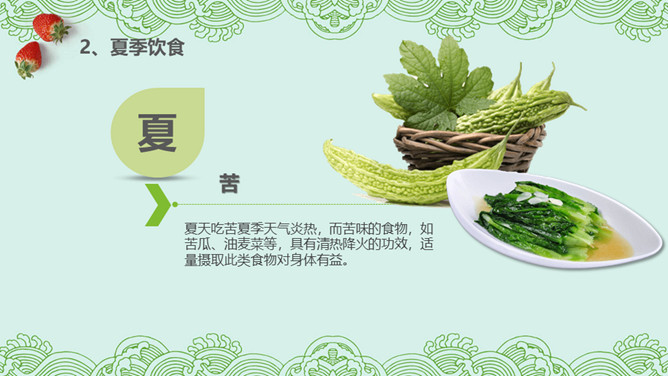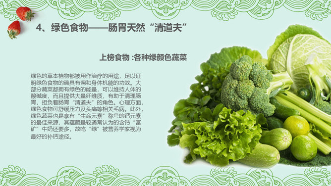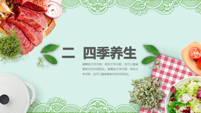 健康日子健康饮食知识PPT模板。目录:食色日子、四季饮食、巧吃食物治百病、喝水也要有讲究、食物的相生相克。