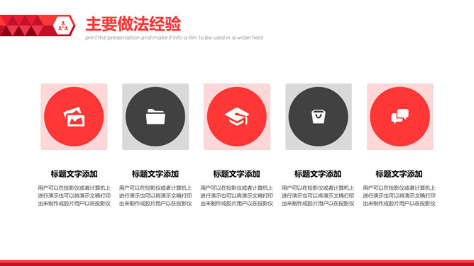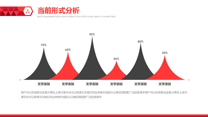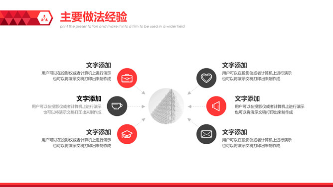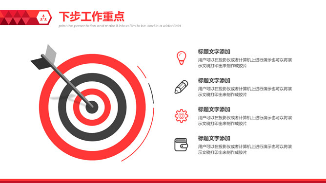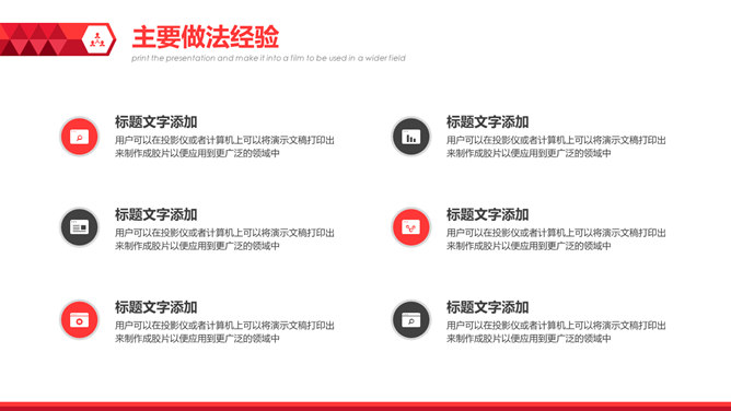 精约通用作业总结陈述PPT模板。一套精约通用作业总结陈述陈述幻灯片模板,赤色主色调,拼接三角形装修。