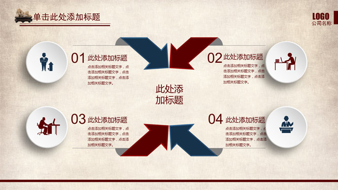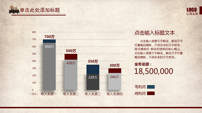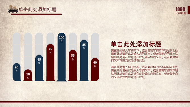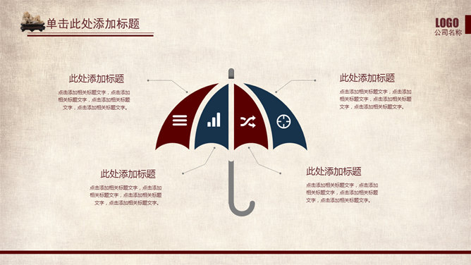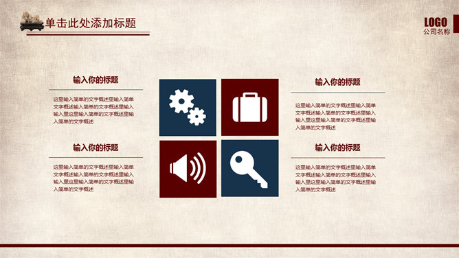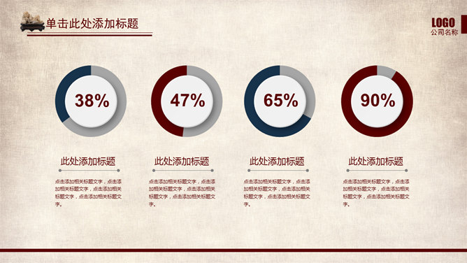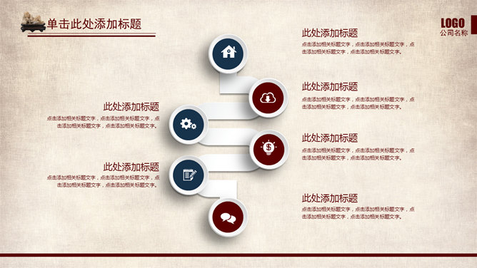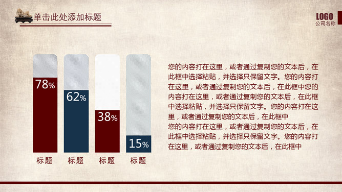 淡雅古典中国风PPT模板。一套精巧中国风幻灯片模板,淡雅古典水墨山水画布景,复古做旧效果。