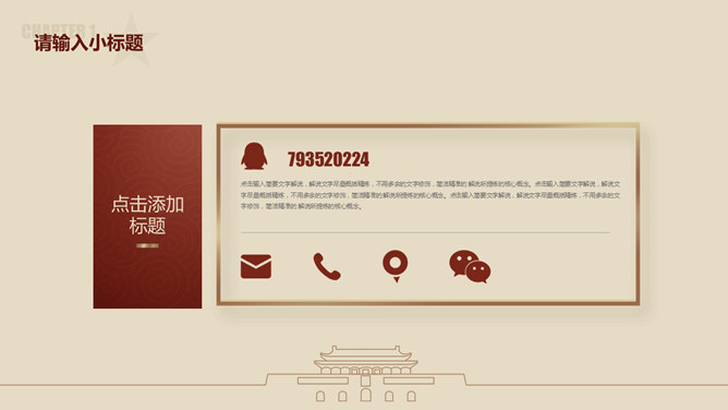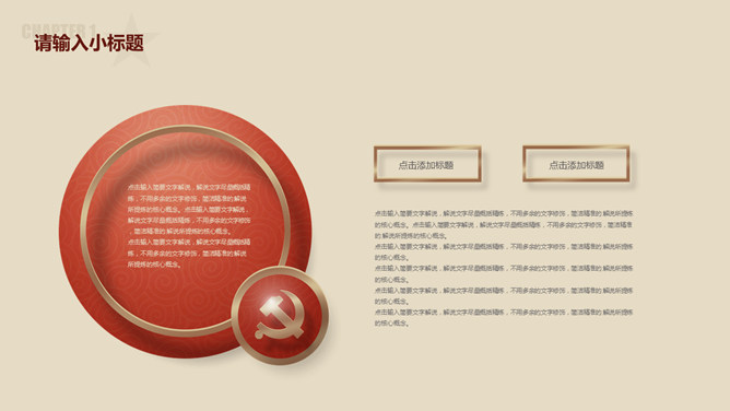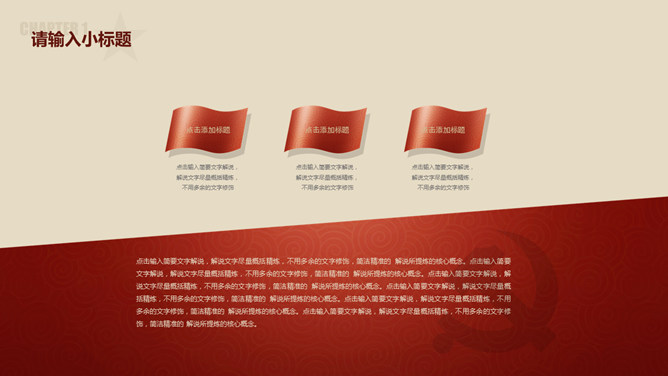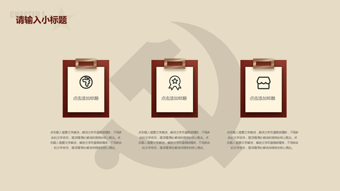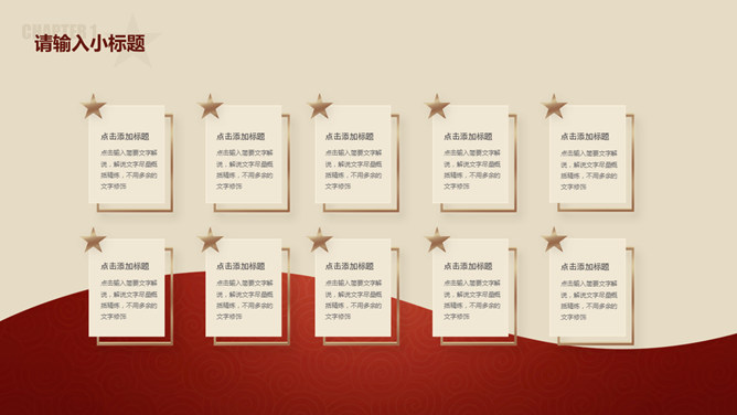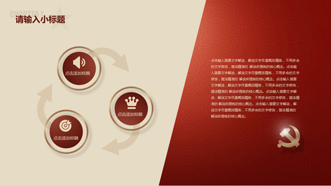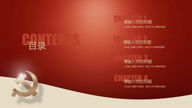 精巧党建党政通用PPT模板。一套精巧党政通用幻灯片模板,大气暗金暗红配色,适用于党建报告等用途。