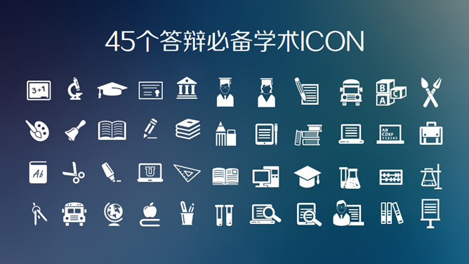 苹果IOS风论文辩论PPT模板。一份时尚美观的苹果风格毕业论文辩论幻灯片模板,共28页,页面类型丰富齐全,功能强大,另有45个学术辩论相关的小图标备用。建议装置字体:方正正黑简体。