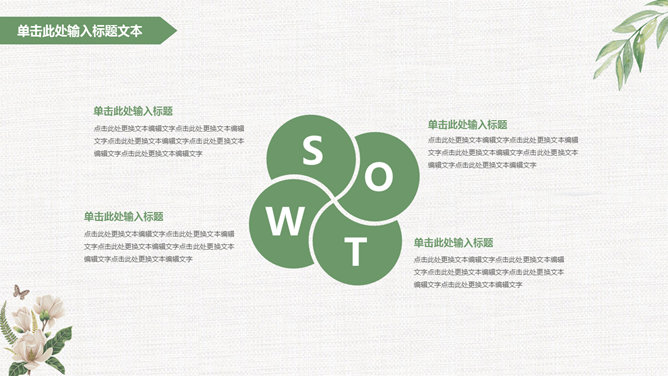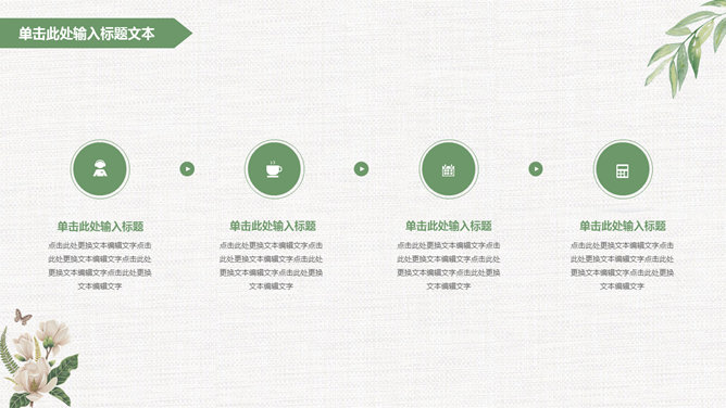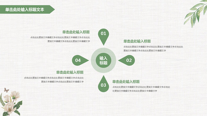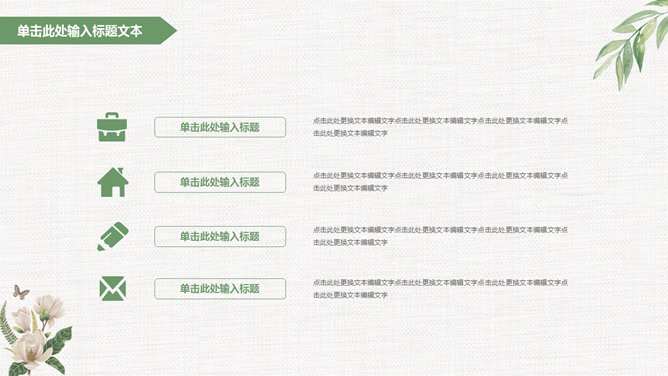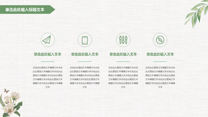 浓艳文艺新鲜通用PPT模板。一套简约通用幻灯片模板,布纹纹理背景,浓艳文艺花草装饰,新鲜绿色主色调。