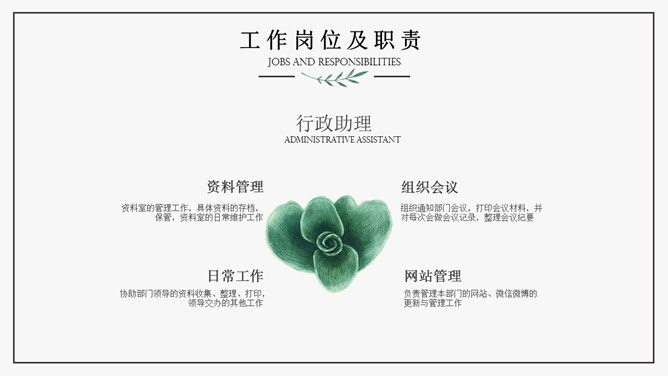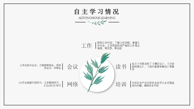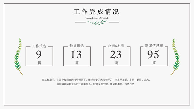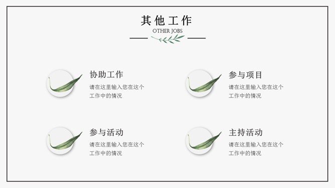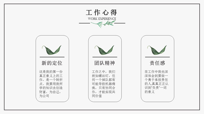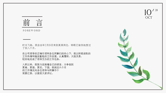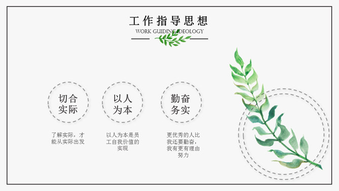清新精约水彩绿叶PPT模板。一套精约通用幻灯片模板,清新水彩效果叶子绿叶装饰,可用于工作总结述职陈述等。