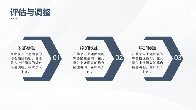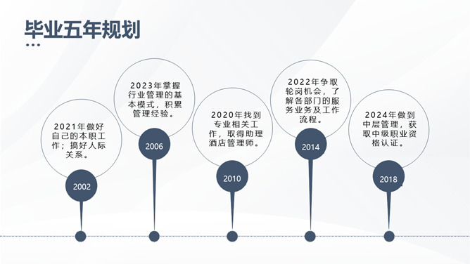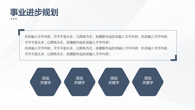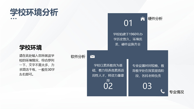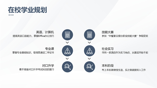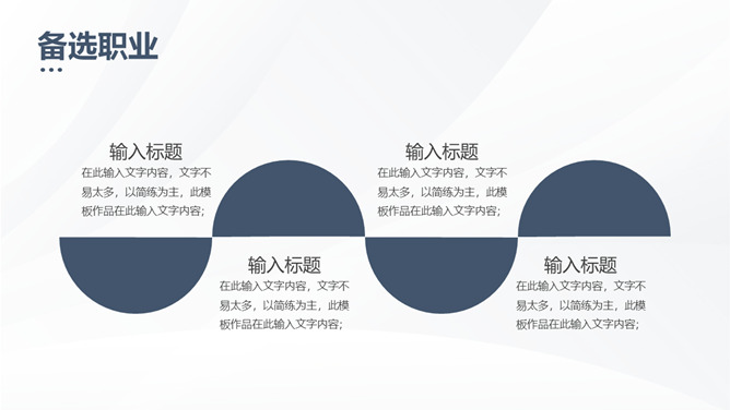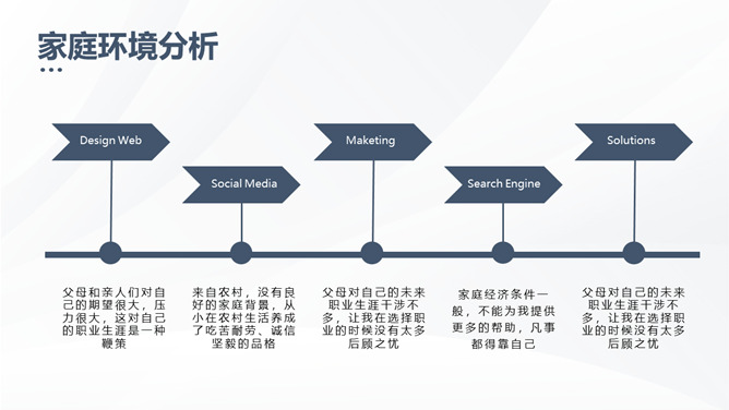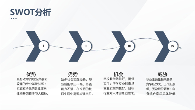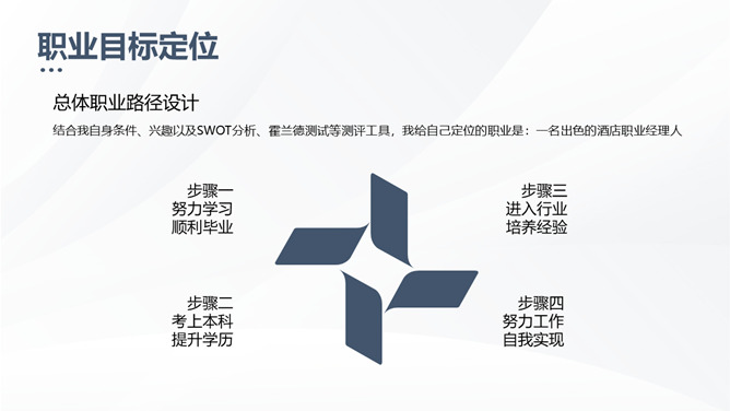 大学生工作生涯规划书PPT模板。一套简约素雅大气工作生涯规划幻灯片模板,包含自我评价、环境分析、方案与实施、评价与调整几个部分。