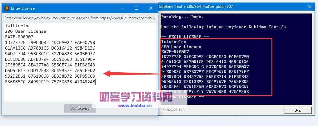 4.提醒:从twitterinc一直复制到末尾位置(不要少复制也不要多复制,否则无效),最后点击“use license”按钮,具体操作如图所示。