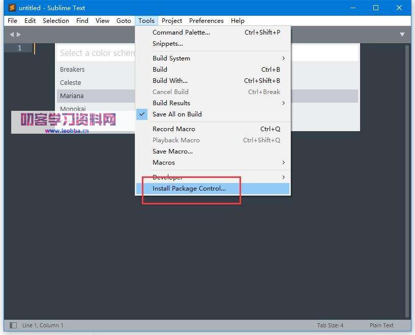 1.点击“Tools”菜单中的“Install Package Control”选项,安装包控件。需要注意的是,安装过程可能比较慢,并且没有任何反应,需要等待数分钟后才会弹出窗口。具体操作如图所示。